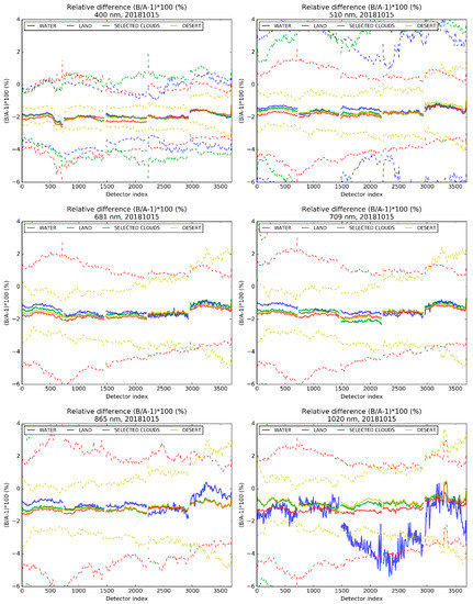 From the tandem data archive, we process the homogenisation methodology over a few orbits of OLCI-A and OLCI-B acquisitions on 15 October 2018. The last tandem date available is chosen here as it exhibits the most stable results for Oa01 which calibration is slightly affected by the efficiency of the temporal degradation model in camera 3 (not shown). We proceed to a statistical analysis, separating water, land, selected cloud, and desert targets. A huge database is aggregated and consists of tens of millions of pairs of pixels. Comparisons are based on the relative differences between the homogenised TOA reflectances rather than on the absolute differences. Indeed, those differences are found more stable than the absolute differences (not shown).