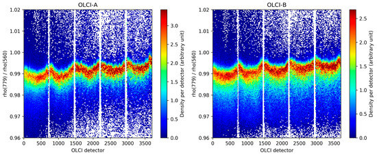 Cross-sensor comparisons are usually employed for radiometric validation purposes (e.g., [22,23,24]. In this particular case, the two OLCI payloads are twin sensors which share the same characteristics but have slight differences in their manufacturing corresponding to limitations in industrial reproductibility. The tandem phase is a unique opportunity to intercompare and intercalibrate the sensors for mission continuity requirements. This provides ideal conditions (two similar payloads observe the same targets nearly simultaneously), allowing to bypass stronger spectral, radiometric, and geometric differences usually faced by cross-sensor comparisons, as well as providing huge statistics out-performing comparisons between different missions.