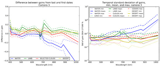 On the left figures, the differences between last and first dates show that the gains are temporally stable to within 0.2% in absolute to the exclusion of water targets from red to NIR and land targets in the red edge (681 and 709 nm), to that respect all cameras do not respond equally. Results over clouds and deserts are mostly below 0.1% in absolute, rarely close to 0.2%.