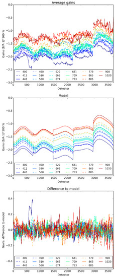 Average cross-calibration gains from selected clouds (top), fitted model (middle), and residuals (bottom).