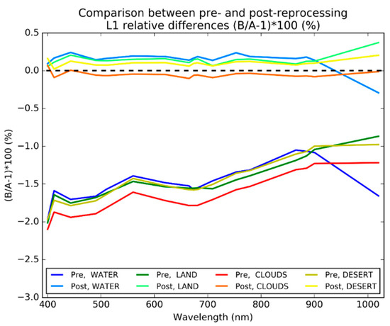 Computations are done for data acquired on 24 September 2018, which is the latest in the tandem which is common to both pre- and post-reprocessing datasets. For the sake of brevity, we compute the mean statistics over all the data (regardless of the camera) and compare pre- and post-reprocessing results. Individual results per target are compared in Figure 12, absorbing bands are not considered.