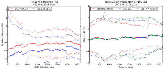 Left: relative differences between OLCI-A or OLCI-B and SLSTR-A for the coincident channel at 560 nm. Right: comparisons between results from the tandem analysis above, ratios from the same dataset as used in collocation with Sea and Land Surface Temperature Radiometer (SLSTR), and double-ratio from the raw results on the left panel.