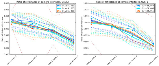 The obtained values are obtained for all bands and allow to quantify relative radiometric discontinuities between the cameras, as obtained from the colocation with SLSTR for only three wavebands (Figure 14 and Figure S8). For the comparison, the values corresponding to the discontinuities in Figure 14 are provided in coloured dots. Only the detectors closest to the interfaces are selected, no BRDF correction being deemed necessary for the purpose.