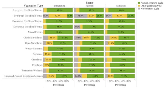 In addition to tropical forests, vegetation impacted by human intervention, such as croplands, tended to have low correlation with the annual common cycle and climate variables. Within this vegetation classification, most vegetation was planted by humans to meet different agricultural demands rather than natural growth, replacing the original vegetation with annual crops or pastures, and is under the influence of the farm management cycles. Therefore, crops with two or three harvests each year may induce a low percentage in the annual common cycle [,,]; in addition, the building of greenhouses and irrigation regimes decreases the impact of temperature and rainfall on crop species. For cropland–natural vegetation mosaics, the correlation to an annual common cycle is also reduced, possibly due to mixed vegetation within one pixel. Meanwhile, in savannas (including savannas and woody savannas) and grasslands, rainfall has also been shown to be the predominant driver for vegetation phenology, as illustrated by the high percentage of annual common cycle and short time lag between the LAI and rainfall, with temperature as a concomitant variable [,], due to the extreme difference in the quantity of rainfall between periods of rainy season and dry season [,].