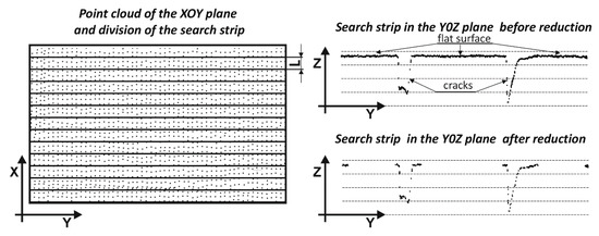 In the next step, step 3, the OptD method starts an automatic and iterative process of data examination and point selection until the desired goal is met. First, the data domain is partitioned in stripes of width L on the horizontal plane (see Figure 1). The width of the strip L is important, as the degree of reduction depends (among others) on this parameter. The initial value L depends on the density of points in the dataset. The input L is taken as the average value of the distance between points. The strips can be horizontal and vertical. It depends on defect characteristics. The width of the measurement strip is automatically calculated and adjusted in subsequent iterations (without the user’s participation). Then, in step 4, the point selection is separately performed on each of such strips by means of the cartographic generalization method [33], whose data reduction rate is strictly related to the current value of the tolerance parameter (t). Since the initial values of L and t automatically set by the OptD method usually do not allow to reach the desired optimization objective, the above process is repeated after automatically resetting the values of such parameters until the obtained results satisfy the chosen criterion. Since this working procedure allows to automatically determine the proper values of L and t, the only human interaction required by the OptD method is the selection of optimization criterion.