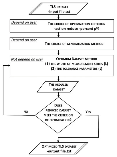 In step 1, the algorithm read the input TLS dataset in *.txt format. Depending on the content of the input file, the user modifies the configuration file. In step 2, the OptD method starts asking to the user to set a proper optimization criterion (f). Such a criterion can specify, for instance, a percentage of the total number of points in the original point cloud, leading to a data reduction of exactly the percentage value specified by (f). This is the most commonly accepted optimization criterion, as the result of optimization is the most characteristic point in the dataset—the higher the degree of reduction, the more visible changes will be on the object. Multiple optimization criteria can also be considered, if needed, in the OptD-multi case [30].