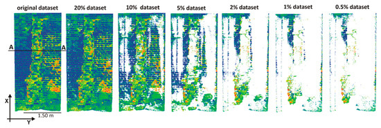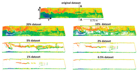 It is also notable that in all the considered cases (see Figure 4, Figure 5 and Figure 6), the 0.5% dataset probably does not allow a proper defect detection. This is a direct consequence of the dramatic data reduction and the specific behaviour of the OptD algorithm, which always preserves a significant amount of points on the borders of the considered area.
