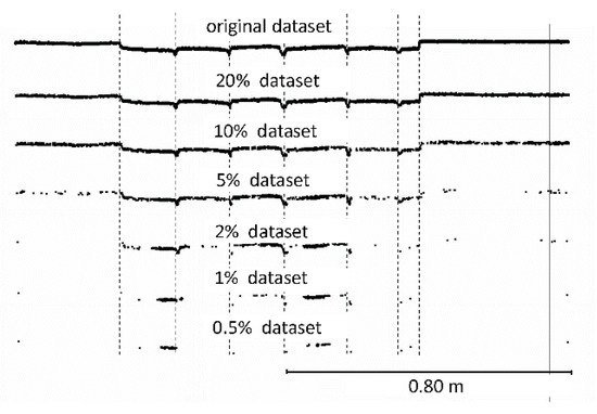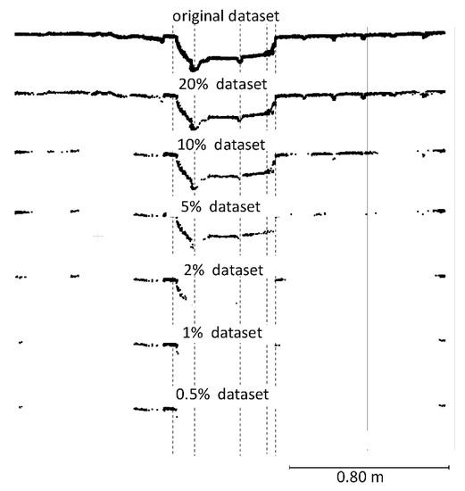 The profiles shown in Figure 9 correspond to a defected area in the concrete element. As shown in this figure (e.g., 2% dataset), the OptD method clearly retains a larger amount of points on areas associated with profile variations, which are more informative for detecting defects.