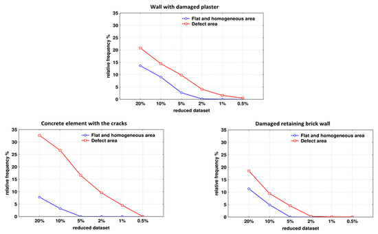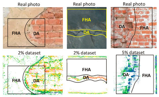A more in-depth analysis of three samples taken from the considered datasets were carried out in order to better investigate this aspect (Figure 11). Each sample has a flat and homogeneous area (FHA) and defect area (DA). The quantitative comparisons between the original and reduced point cloud for FHA and DA are presented in Table 4. As a result of a visual assessment, it was found that considering the 2% dataset is sufficient to execute a proper diagnosis of both the wall with damaged plaster and the concrete element with cracks. Differently, the 5% dataset shall be used in the case of damaged retaining brick wall. Figure 11 reports the percentage of points kept in the FHA and DA in all considered cases.