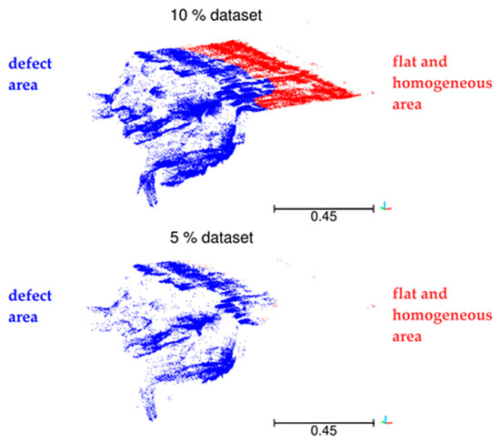 Figure 12 presents the distribution of points that obstruct a homogeneous area and defect area. The figure was prepared based on the sets after the optimization criterion of 5% (similar to Figure 11) and the level above, i.e., 10%. OptD processing results in a different degree of reduction in different areas of the object. On places that are not very varied, few points remained (red colour in Figure 12), and on complex surfaces there were more points (blue colour in Figure 12). Thanks to this property of the OptD method, we can find object defects while reducing the size of the dataset.