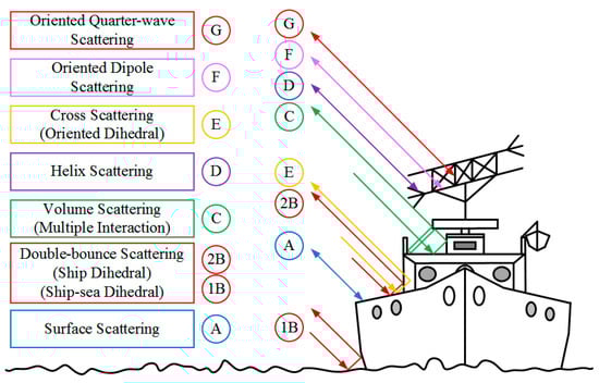 Let us go deeper into the scattering analysis of ships, as presented in Figure 2. As is generally known, the most remarkable is the surface or double-bounce scattering, which occurs on the deck or ship–sea dihedrals (or ship dihedrals). Additionally, there exist certain parts of helix scattering and cross scattering, as introduced before. A more noticeable observation is that the complex superstructures composed of dipole-like structures (such as towers, antennas, and guardrails) on ships can induce distinct ±45° OD and ±45° OQW scattering. This explains that integrating the ±45° OD and ±45° OQW scattering models into the decomposition scheme can achieve the refined characterization of ship scattering. It should be noted that in the volume scattering models, the multiple scattering happens on different structures on ships, barring the helix, cross, ±45°OD, and ±45° OQW scatterers, which are accounted for in the complex structure scattering components.
