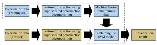 The procedure of the SVM-based recognition involves the following concise steps: (1) Collection of training data, (2) Construction of feature and feature vectors, (3) Machine learning with training data, (4) Obtaining of the SVM model, and (5) Classification with the SVM model and test data. The flowchart of the proposed SVM-based ship recognition scheme is shown in Figure 3.