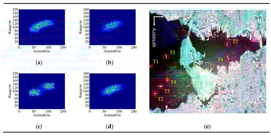 The real polarimetric radar data for ships is acquired from the Radarsat-2 spaceborne system over a test site in Vancouver, Canada. To acquire a visually pleasing representation, the multilook processing is, respectively, performed with factors 2 and 1 in the azimuth and range direction, which results in a resolution of 4.87 m × 4.73 m in the ground area. Figure 4e shows the C-band Pauli color-coded images (1693 pixels × 1501 pixels), where seven ships (denoted by T1–T7) are marked by red rectangles.