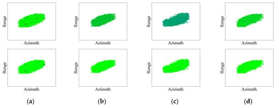 This work applies the simulated polarimetric radar data for chaff clouds, as in [30]. Three cases of typical distributions of chaff clouds are simulated, i.e., Case 1 with uniform distribution for the orientation angle and sinusoidal distribution for the zenith angle, Case 2 with the orientation angle obeying the uniform distribution while the zenith angle is distributed at a specific interval, and Case 3 with the orientation angle with uniform distribution and the zenith angle with normal distribution (centering at 20° and 90° for Case 3-1 and Case 3-2, respectively) [30]. In order to attain similar dimensions as ships, assuming that 20,000 chaffs are initially dispersed within a cube space with size of 30 m after 120 s, the results of the diffused chaff clouds in different cases are simulated, as given in Figure 4a–d. To save space, only the HH polarization intensity images are presented.