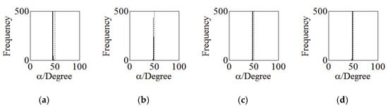 To make full use of the information derived from polarimetric decomposition, the average scattering angle, i.e., , is incorporated to enhance the recognition performance. Figure 7 and Figure 8 give the histograms of for chaff clouds and ships, respectively. It can be seen that for chaff clouds in different cases, almost all of have values of about 45°, which is consistent with the theoretical analysis. Meanwhile, for ships, in addition to T1, T2, and T4 (their values lie between 50° and 90°), the calculated does not correspond to double-bounce scattering. This actually relates to the complex structures of ships, which validates the effectiveness of the complex structure scattering from another side.