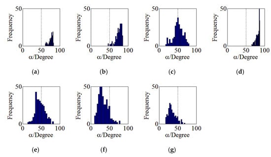 Histograms of for ships. (a–g) T1, T2, T3, T4, T5, T6, and T7, respectively.