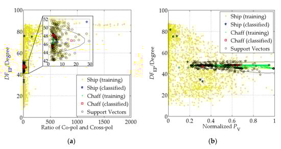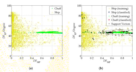 In order to visualize the difference, the scatter diagram of data points in the two dimensional − plane is shown in Figure 9a. It is intuitive that a special pattern of green colors is clearly noticed, indicating that ships and chaff clouds can be easily distinguished in the proposed plane. With the constructed discrimination features, the recognition of ships and chaff clouds is implemented through obtaining the trained SVM model. All the data points of ships and chaff clouds are used for training, while the corresponding averages, i.e., seven data points of ships and four data points of chaff clouds, are selected to be classified (i.e., for testing).