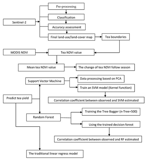 NDVI has been used for tea yield prediction in the last decade. Dutta [22] mentioned the prediction of green leaf tea yield and carried out tea yields based on the image-derived leaf area index (LAI). To further check the relationship between MODIS NDVI and LAI, an empirical equation was established. However, it was found that the NDVI observations at different time periods could not interpret much contradiction in tea leaf yield. Dutta [10] tested whether MODIS derived NDVI was related to LAI and an empirical equation was established that showed that LAI in tea had a significant and linear relationship with NDVI. Empirical relations between the NDVI and crown density were investigated, whereas the relation between the crown density and tea yield remains to be investigated by F Fauziana [23]. In order to predict tea yield, the statistical relationship was established between climate variables, which were regarded as predictor parameters and tea yield (predictand), by [24,25,26,27,28]. All studies used meteorological data, or satellite image data, or the incorporation of these two to establish empirical models for tea yield prediction. However, performances of yield prediction using empirical methods mostly use the traditional linear regression model (TLRM). Machine learning is also an efficient empirical method for classification and prediction. Jaikla et al. [29] estimated rice yields using SVM (support vector machine). Kim and Nari [30] described the corn yield estimation in Iowa State using four machine learning approaches such as SVM (support vector machine), RF (random forest), ERT (extremely randomized trees) and DL (deep learning). Narayanan Balakrishnan [31], Priya [32], and Arun Kumar [33] proposed a crop yield prediction model such as the SVM classification technique. Yaping Cai et al. [34] used three mainstream machine learning methods (SVM, RF, and neural network) to build various empirical models for yield prediction. The random forest algorithm was also considered as a strong tool for predicting the yield of the crop. To improve the prediction accuracy of tea yield, our work proposes a prediction model for yield forecast based on support vector machine (SVM) and random forest (RF) to replace the traditional linear regression model (TLRM). Furthermore, comparisons of the validation statistics among them are presented.