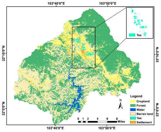 The spatial coverage of the area is small, but brings great economic profit for the citizen. Based on the classification result, it is clear that forest, shrub, and barren land made up the largest area, which can be explained by the fact that this is a mountainous district in the province. The fraction of tea plants is the second largest in the district’s crop structure, estimating for 25% of the agricultural land area, but as tea is a crop with high economic efficiency, we focused on its development.