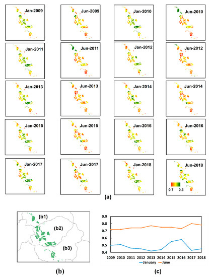 (a) Normalized Difference Vegetation Index value of tea in Tanuyen in January and June from 2009 to 2018 at each garden; (b) Tea garden location, (b1) Phuc Khoa, (b2) Tanuyen town, (b3) Trung Dong-Than Thuoc; (c) The monthly average.