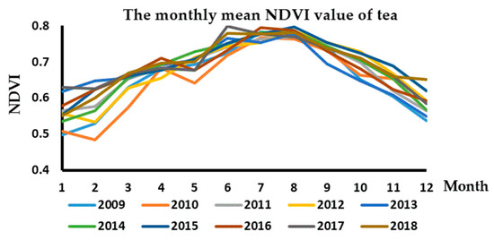 The tea NDVI value increased from March to September, and obtained the highest value in July, August, and September. The tea NDVI value decreased from October to February of the next year, and obtained the lowest value in January and February. The mean NDVI value of tea changed each month from 2009 to 2018, as shown in Figure 5. The minimum and maximum average values of NDVI were calculated in the period from January 2009 to December 2018 (Table 3). The result of the study showed that the minimum NDVI value was 0.42 during January 2013 and February 2015 and 2016. The maximum NDVI values were in August 2015 and June 2017.