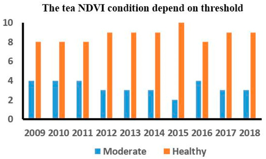 The USGS [41] suggests that “NDVI values range from +1.0 to −1.0. Areas of barren rock, sand, or snow usually show very low NDVI values (for example, 0.1 or less). Sparse vegetation such as shrubs and grasslands or senescing crops may result in moderate NDVI values (approximately 0.2 to 0.5). High NDVI values (approximately 0.6 to 0.9) correspond to dense vegetation such as that found in temperate and tropical forests or crops at their peak growth stage”. Depending on the threshold, we proposed the class names as “moderate” and “healthy” for monitoring tea NDVI condition for the four seasons in a year (Figure 6), with a rank of 0.4 to 0.59 being moderate and ≥0.6 being healthy (high NDVI value). From 2009–2018, the number of months for “moderate” tea was 33 (27.5%) and “healthy” tea was 87 (72.5%).