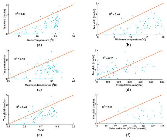 The climatic variables and NDVI were considered as predictor variables in the TLRM, SVM, RF, model. Meanwhile, the climatic variables include mean temperature, minimum temperature (Tmin), max temperature (Tmax), precipitation, and solar radiation. To determine the impact of these variables, we carried out regression models between the tea yield (predictand) and NDVI and meteorological factors (predictor variables), shown in Figure 7.