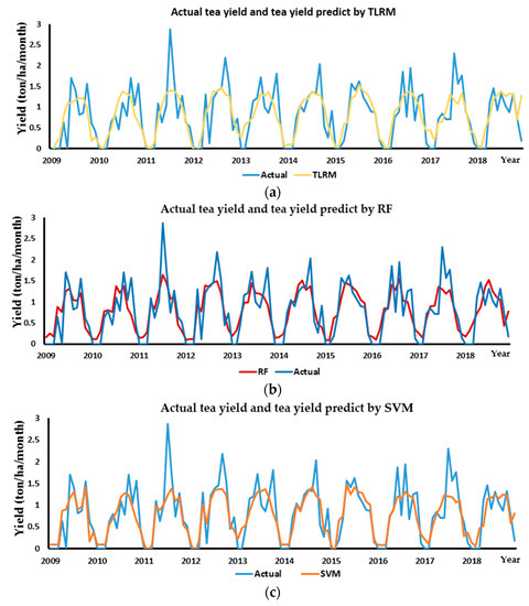 To forecast tea yield, two mainstream machine learning methods were used: support vector machine (SVM) and random forest (RF). The traditional linear regression model (TLRM) was also established by the same data to compare the accuracy of TLRM, SVM, and RF and a scatter plot of the monthly observed and predicted tea yield at Tanuyen was derived using SVM, RF, and TLRM. The performances of SVM, RF, and TLRM were compared in the study to select the best method to predict tea yield in Tanuyen.