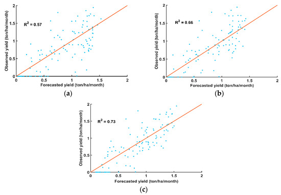 Scatter plots for monthly observed yield and forecast by SVM, RF, and TLRM from2009 to 2018 in Tanuyen District. (a) The observed tea yield and forecasted tea yield by TLRM; (b) The observed tea yield and forecasted tea yield by the SVM model; (c) The observed tea yield and forecasted tea yield by the RF model.