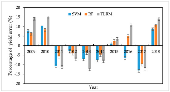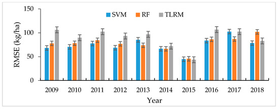 The RMSE (kg/ha) between tea yield forecasts and observations on the SVM, RF, and TLRM model period of 2009–2018. Error bars represent one standard error.