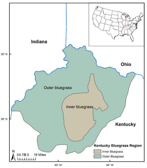 - Ulack, R.; Raitz, K.B.; Hopper, H.L. Lexington and Kentucky’s Inner Bluegrass Region. Pathways in Geography Series, Site Guide Title No. 10; ERIC: 1994. Available online: https://eric.ed.gov/?id=ED383629 (accessed on 25 April 2020).