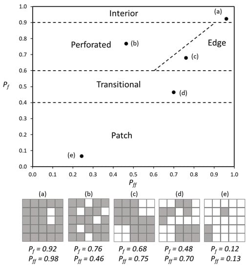 Illustration for the calculations of Pf and Pff for various fragmentation categories in a moving window of 5 × 5 pixels. Grassland: grey pixels; no-grassland: white pixels; dashed line: the classification bounds for the various categories of grasslands (adapted from Riitter et al., 2000 [] and Frate et al., 2015 []).