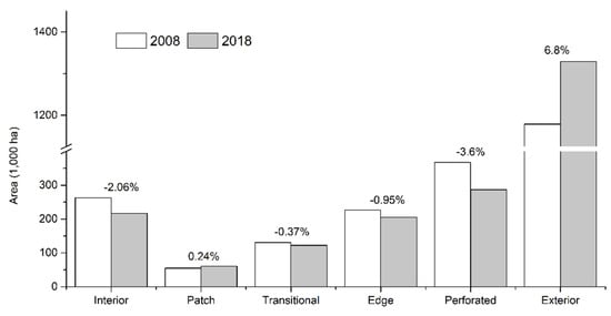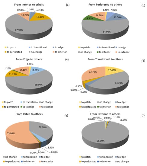 Changes between fragmentation categories during 2008–2018: (a) from interior to others, (b) from perforated to others, (c) from edge to others, (d) from transitional to others, (e) from patch to others, and (f) from exterior to others.