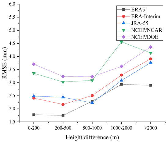 The change of RMSE values for ERA5, ERA-Interim, JRA-55, NCEP/NCAR, and NCEP/DOE reanalysis water vapor products relative to GNSS PWV with the change of height difference between GNSS and five reanalysis products (source: own elaboration).