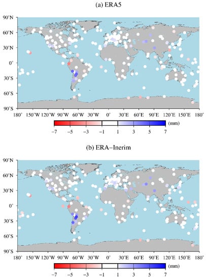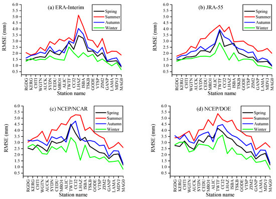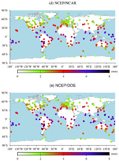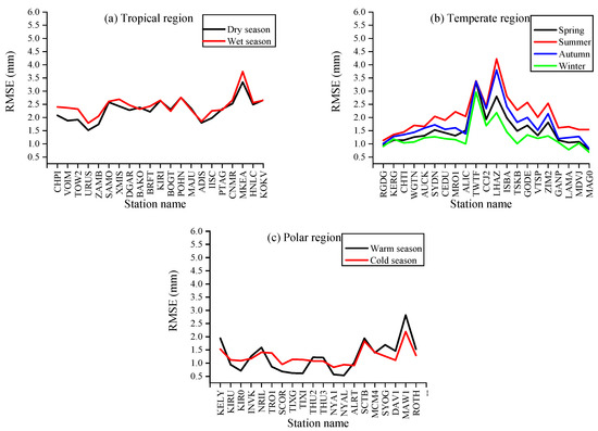 As can be seen from Figure 7, RMSE values of ERA5 in the polar regions have no obvious seasonal variations. The RMSE values of ERA5 in the wet season are slightly greater than those in the dry season in some GNSS stations, which demonstrates that some seasonal variations are not significant in the tropical regions.