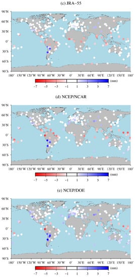 Lastly, the effects of seasonality on the accuracies of the five reanalysis products are analyzed. The results indicate that the RMSE values of ERA5 in the polar regions do not have obvious seasonality. However, RMSE values of five reanalysis products in the temperate regions vary significantly with the seasons, and those in summer and in winter are the largest and the smallest in the temperate regions, respectively. Seasons in the tropical regions which are controlled by precipitation variability are divided into the dry season and wet season. RMSE values with respect to reanalysis products in wet season are slightly greater than those in dry season in some GNSS stations. The results demonstrate that there are certain seasonal variations which are not very significant in terms of RMSE values with respect to reanalysis products in the tropical regions. Our future research will focus on assimilating GNSS PWV into global reanalysis products and improving the accuracy of the reanalysis products. In addition, it is also necessary to analyze the PWV accuracy of the five reanalysis products over the ocean regions.