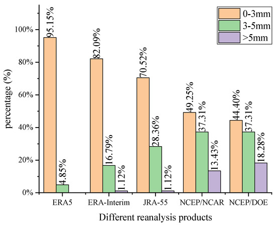 According to Figure 5, the percentages of ERA5 and ERA-Interim, the RMSE values of which are less than 3 mm, exceed 80%. The percentage of ERA5 whose RMSE values are less than 3 mm is more than 95%. The percentages of two NCEP reanalysis products with the RMSE of greater than 5 mm exceeds 10%. The results indicate that the accuracies of ERA5, ERA-Interim, and JRA55 are higher than those of two NCEP reanalysis products, and ERA5 has the highest accuracy among five reanalysis products.