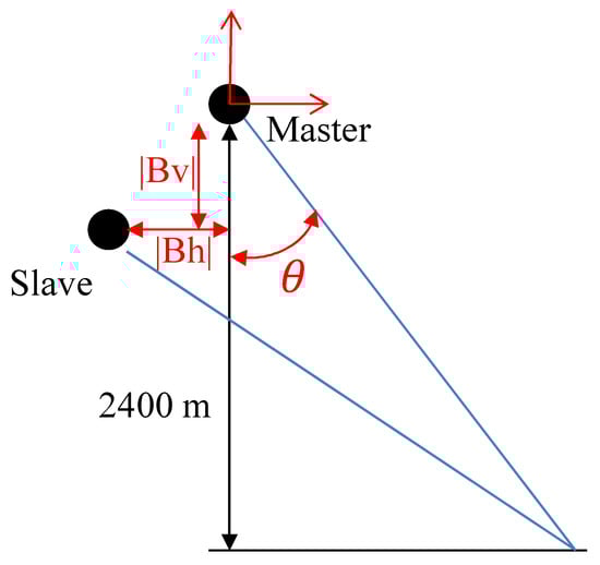 In order to choose the appropriate repeat-pass baseline, a performance analysis has been conducted. The analysis modeled the geometry of the repeat-pass acquisition as defined by the altitude above ground of the master acquisition plus the horizontal (Bh) and vertical (Bv) separation to the slave, as shown in Figure 2. A few options for Bh and Bv were considered (see Table 2), and the corresponding height of ambiguity, spectral shift and, eventually, height sensitivity were assessed. In all cases, we considered an output grid with 1 m × 1 m sampling, an altitude above ground of around 2400 m, and a valid off-nadir range from 25 to 55.