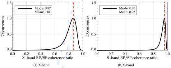 A constant value of temporal decorrelation was considered for each frequency band. For the single-pass scenario, was assumed, whereas for the repeat-pass one, temporal decorrelation factors of 0.8 and 0.9 were assumed for X- and S-band, respectively. These values were empirically selected considering our previous data acquisition over the Jade bight. For the selection, a simple analysis was conducted considering an area which mainly contained tidal flats. For this area, the ratio between repeat-pass and single-pass coherences was regarded as a measure of the temporal decorrelation. This assumes that differences in the system parameters/antenna diagram of the two channels of the single-pass interferometer are negligible, that geometric decorrelation is mostly accounted for by the range-spectral filter; and that backscatter changes between master and slave acquisition times can be neglected, at least for the majority of the considered region. The latter assumption, in particular, is not always true due to the high dynamics of the observed area. However, the analysis can still help to grasp the average temporal decorrelation value over tidal flats. The histograms of the repeat-pass to single-pass coherence ratio from the Jade bight data are shown in Figure 4.
