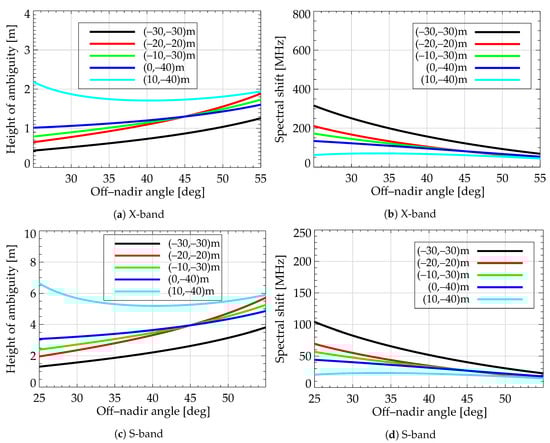 Expected repeat-pass (a,c) height of ambiguity and (b,d) spectral shift for the different baseline configurations. The plots on the top correspond to the X-band case, while the ones at the bottom correspond to S-band.