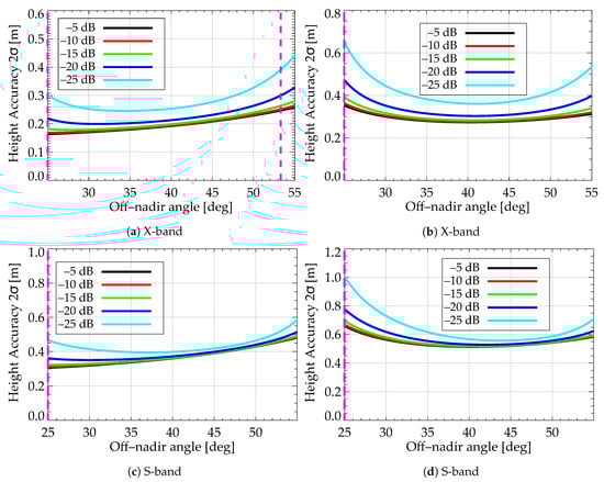 Expected height accuracy of (a) X-band and (b) S-band single-pass height models, for different values of backscatter. The magenta lines mark the valid swath considering an accuracy requirement of 30 cm (2) and a backscatter coefficient of −20 dB. If only the line on the left is visible, it indicates that the requirement cannot be met at any portion of the swath.