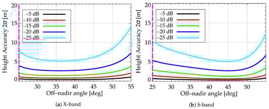 Figure 6 shows the expected repeat-pass height accuracy for cases 4 and 5 (2). The results consider that the height standard deviation can be modeled with Equation (2), i.e., only taking into account temporal and SNR decorrelation as error sources. Eventual residual low-pass artifacts or unwrapping errors are not considered at this point. For backscatter coefficients ranging from −5 to −15 dB, case 4 allows for a vertical height accuracy of 2 < 30 cm for the majority of the swath in X-band. A backscatter of −25 dB will limit the valid swath to around 47, if only X-band repeat-pass data is employed for the generation of the final product. Case 5 has worse performance in general, and for the −25 dB backscatter case, the accuracy of X-band repeat-pass goes beyond 50 cm for both near- and far-range. On the positive side, it presents more homogeneous performance within the swath in comparison to case 4.