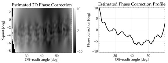 In addition, the calibration included the estimation of a residual antenna phase error to correct for small phase inaccuracies in the on-ground characterisation of the antenna patterns. These errors derive from multi-path effects that cannot be faithfully reproduced in the antenna measurement, which only includes the antenna mount but not the entire aircraft, as well as phase noise in the quiet zone of the antenna test range. This antenna phase correction estimate was carried out using interferometric phase differences measured over distributed targets in the range-Doppler domain to yield a 2D phase correction, in terms of off-nadir angle and squint, for each slave antenna of the S- and X-band interferometers. The squint-variant estimate helped to ensure that the correction is applicable for all acquisition geometries encountered in the field. The estimated phase correction for the X-band antenna is illustrated in Figure 8. The phase screen is added to the antenna pattern correction of the single-pass slave channels.