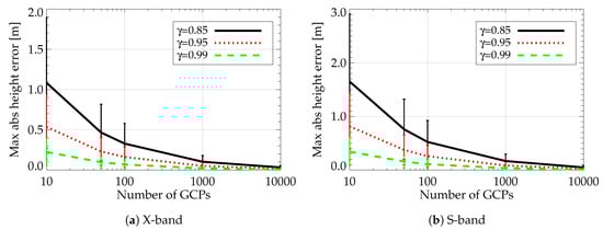 Expected maximum height error caused by the global offset mis-calibration as a function of the number of GCPs. (a) X-band results and (b) S-band results.