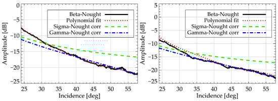 (Left) S-band VV amplitude profile of a reference stripe in the Otzumer Balje test site. The plot shows, additionally, the fitted polynomial, and the and correction terms. (Right) Profile obtained for another parallel stripe and the polynomial fit obtained with the reference one.