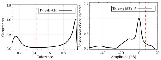 (Left) coherence and (right) amplitude histograms for the Otzumer Balje test site. The amplitude histogram includes only the samples from the low coherent areas.