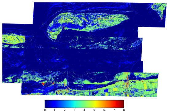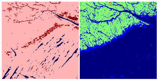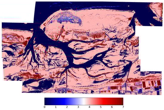 A small modification on the ordering of the original entropy-alpha classes was performed, going from low to high entropy within the same type of reflection (see Figure 15 and Table 4). This reordering step is necessary since feathering on overlapping classes is not defined. For the mosaicking of labels, a ceiling approach (taking the highest class value on overlapping pixels) is applied instead of border feathering, prioritizing the preservation of high entropy classes. Nonetheless, some areas of the polarimetric mask are still affected by different water levels and incidence angles leading to residual border effects during the mosaicking.