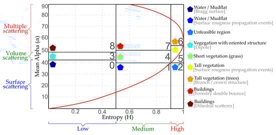 In the case of the polarimetry mask, the standard entropy-alpha unsupervised classification scheme was performed [34]. The entropy-alpha classifier utilizes the polarimetric information that is not considered in the interferometry mask. This allows for the removal of inconsistencies in the interferometric mask due to difficulties in separating vegetation from low-coherence mudflats.