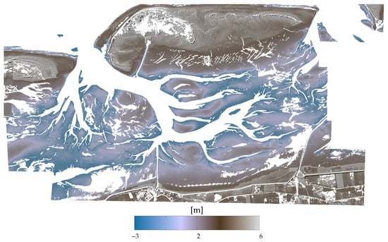 In this section, preliminary results from the Otzumer Balje test site are given. Figure 16 shows the retrieved X-band single-pass DEM, while Figure 17 shows the fused XS repeat-pass DEM. No post-processing masking was applied. As expected, flooded areas are naturally marked as invalid in the repeat-pass DEM, due to their low coherence. On the other hand, the single-pass DEM contain valid values for the water surface. For the results shown here, the low-resolution ALS DEM acquired in 2014 (10 m resolution) was used as reference to correct for residual low-pass artifacts in the single-pass DEMs, as explained in Section 4.2.6. However, residual artifacts are observed for areas which contain water for the majority of the swath. This is either due to interpolation errors of the estimated residual baseline errors (when no data is available) or poor conditioning of the minimization problem (when only a small portion of the swath has valid data).