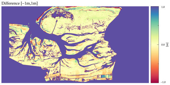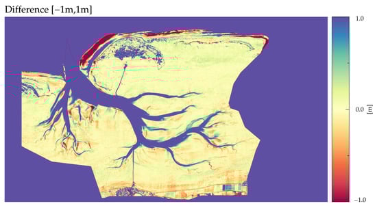 The differences between the obtained SAR DEMs and the available full-resolution ALS DEM acquired in 2014 (1 m resolution) are shown in Figure 18 and Figure 19, scaled from −1 m to 1 m. Overall, a good consistency is observed between the products. Strong changes in the coastal areas in the north are also visible (larger than 1 m), as well as smaller changes within the tidal flats. Changes in vegetation height are also clearly visible in the fields in the coastal mainland areas in the south.